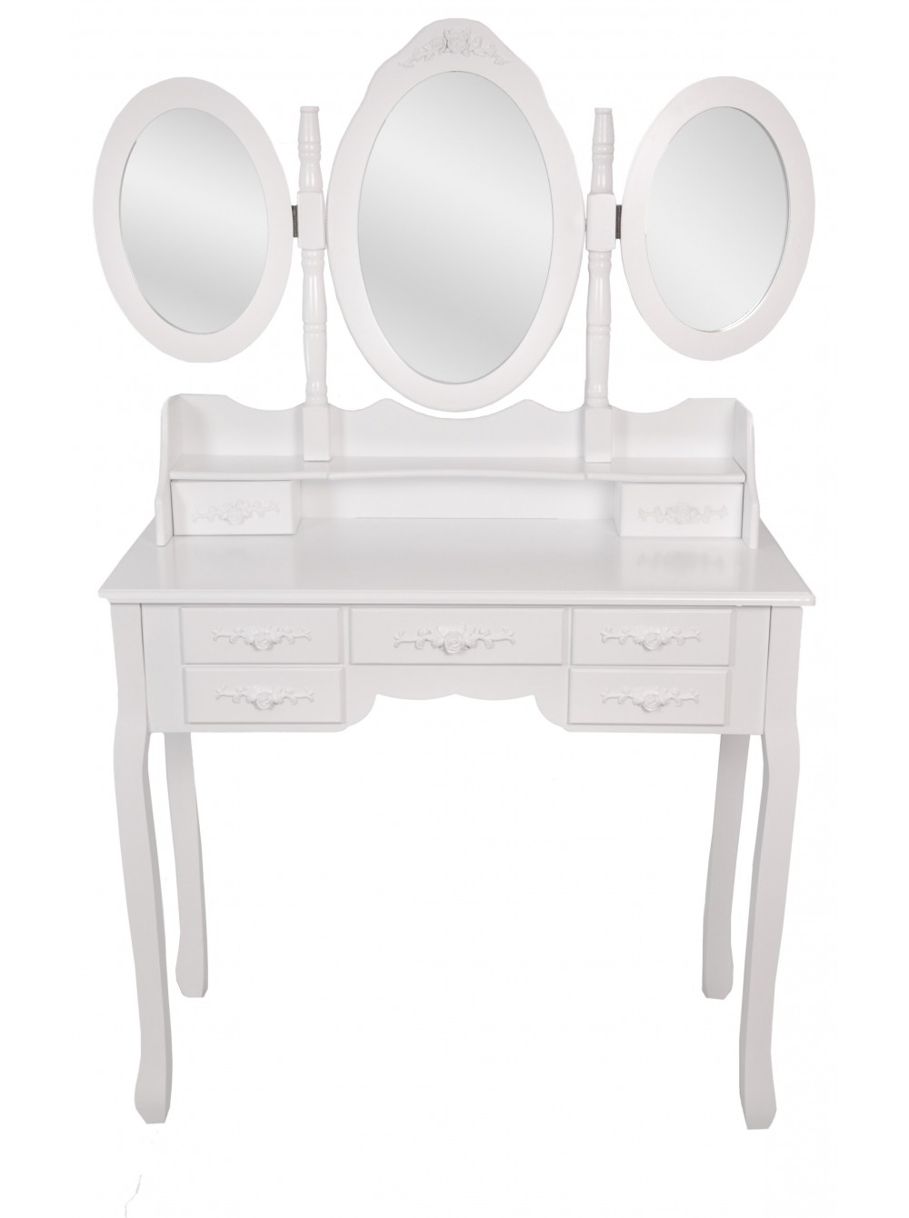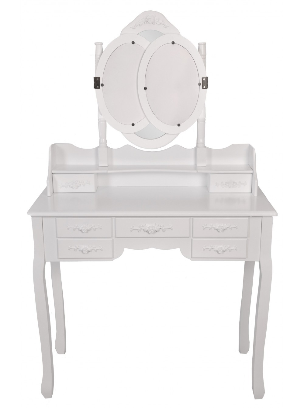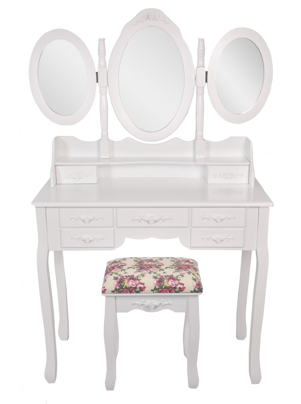 Цей елегантний і стильний туалетний столик Bonro-B020 з дзеркалом без сумніву знайде своє місце у вашому домі. Незалежно від того, чи використовується він як косметичний столик, туалетний столик або як проста одиниця зберігання, дизайн робить його практичним і декоративним предметом. Сім просторих ящиків надають додаткове місце для зберігання всіх ваших особистих речей. Овальне дзеркало, що повертається на 360 °, і два складних бічних дзеркала дозволяють легко наносити макіяж і в короткі терміни виконати кожну зачіску, красива тканина стільця відмінно доповнить романтичний стиль туалетного столика.